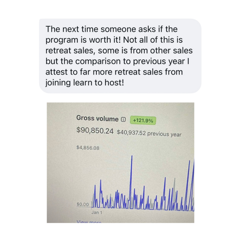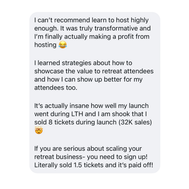 Because I'm a numbers-and-hard-proof kinda gal (and I bet you are too). Not only do the strategies that I teach in Learn to Host helped get my own retreat-hosting business to where it is today, but it's already helped several other hosts! I launched a trial-run of this coaching program to select students before launching to the public, and now I have some hard-proof from past student that this sh*t WORKS!